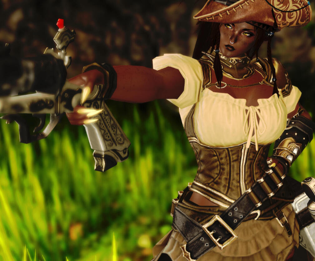 The obvious one: Ajhisi is a pirate and has been one since her very early adolescence. There is a short period of time while she was marooned on an island and subsequently imprisoned by the Sahagin in which she was not actively engaging in piracy, but other than that, they've been consistently found sea-bound or sky-bound — typically the former. If she's around any of her crew, there's a sense of hierarchical respect for her among them.Maybe your character:• is also a pirate. This could mean they've been part of the same crew in the past, have crossed paths either out at sea or in some other situation, or are currently part of the same crew (discuss with me first, please!)• has crossed paths with Ajhisi in a port town or dockside tavern, brothel, lounge, etc. and recognises her. It's not above her to have started a tavern brawl or caught your eye in some other way.• is a member of the Rogues' Guild. She doesn't spend much time with the guild, but she's been spotted with one or two members on more than one occasion. There's a tense familiarity between Ajhisi and Jacke Swallow.