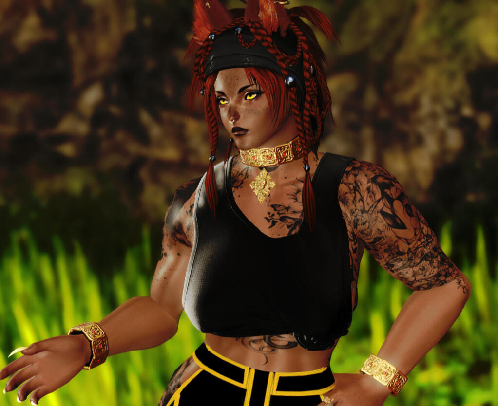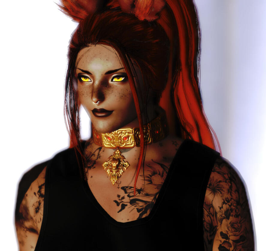 HEIGHT 6’1”HAIR RedEYES Amber brown, glinting goldPIERCINGS Septum; multiple ear piercingsSCARS / TATTOOS / MARKINGS Various nautical tattoos, many old scars. Freckles dotting the entirety of her body and face.PHYSIQUE/BODY TYPE Broad-shouldered and lean, with uneven muscular development, suggesting having endured scarcity of nourishment and/or resources while surviving the strain of a demanding and harsh environment. Naturally prone to building muscle easily, but still in recovery.DISTINGUISHING FEATURES Distinctly uncommon ears—squirrel-like, rather than the Vieran norm.